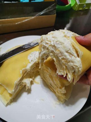 6. 制作榴莲馅:将榴莲馅均匀涂抹在千层饼皮上,然后卷起,切成小段。